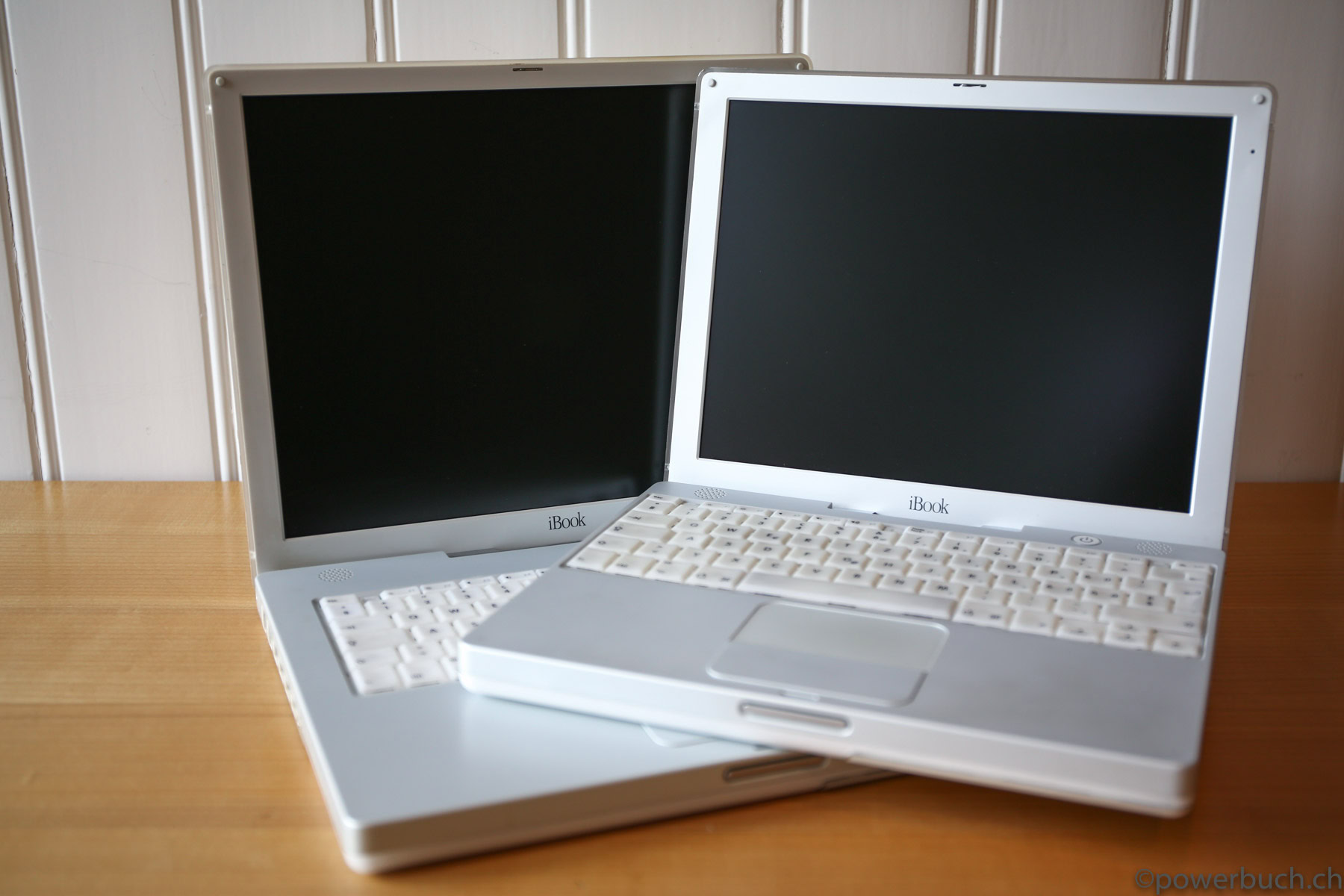 The next generation ibook G3 lost the previous bold colors and bulky form-factor, as were the handle, latch-less design, and additional power connectors on the bottom surface.
