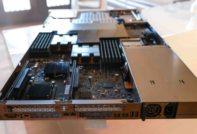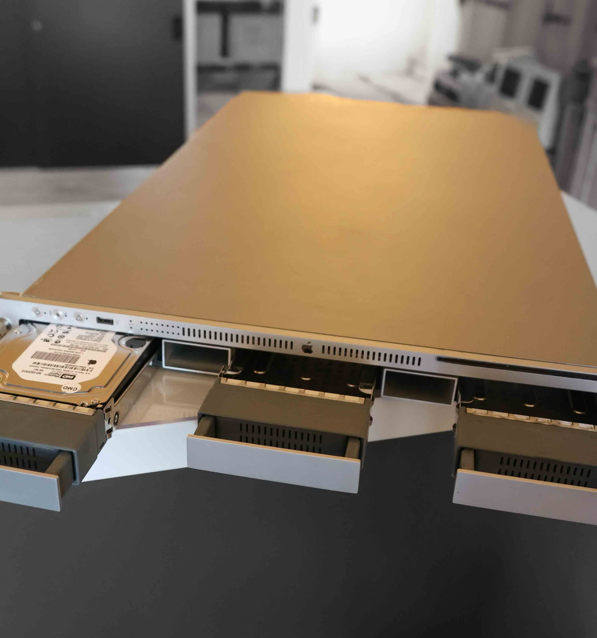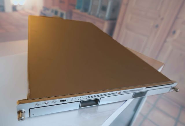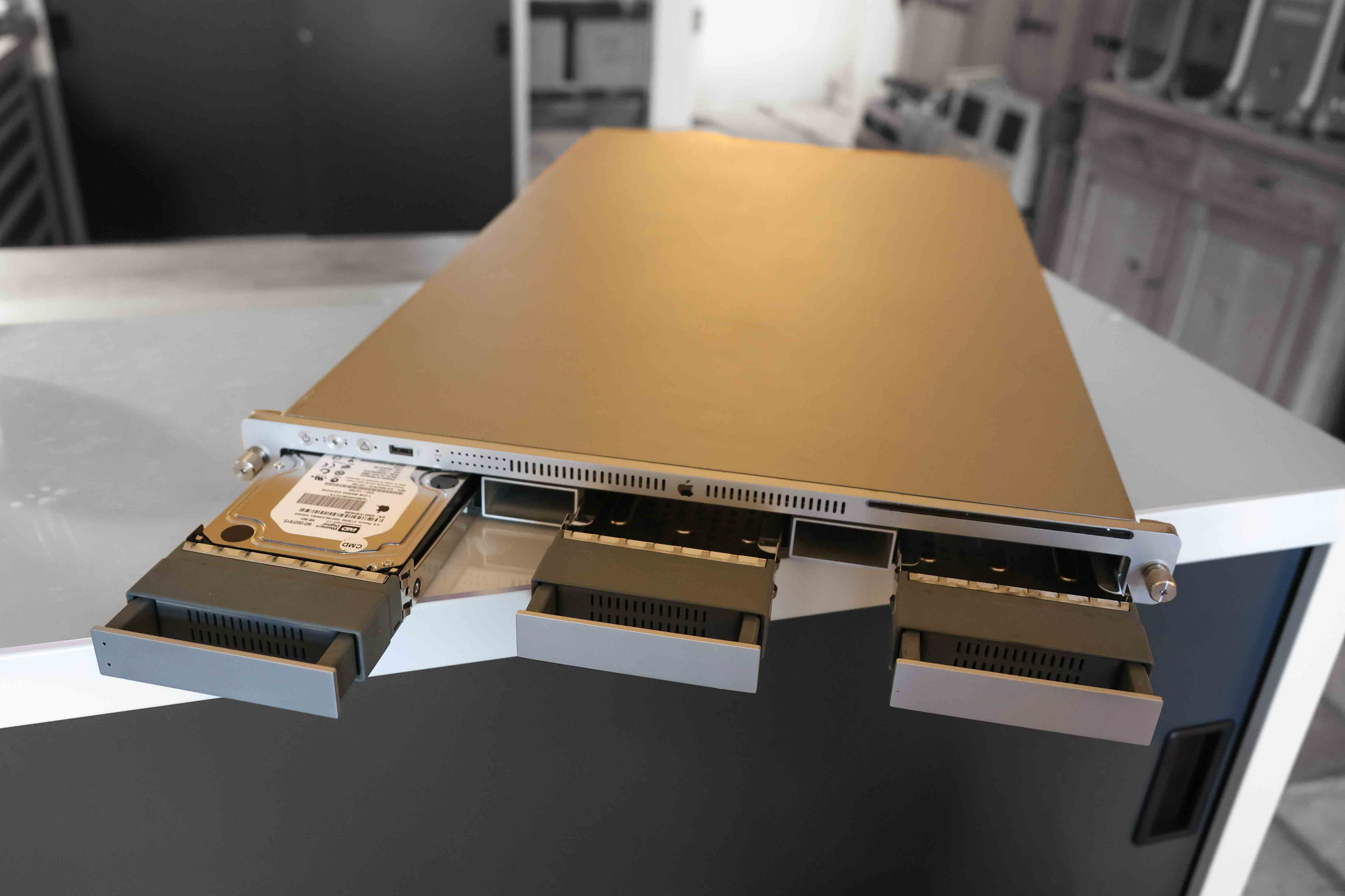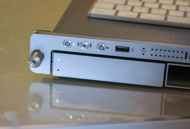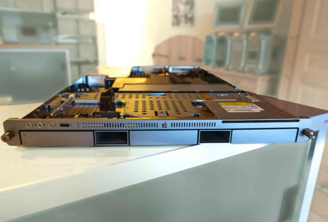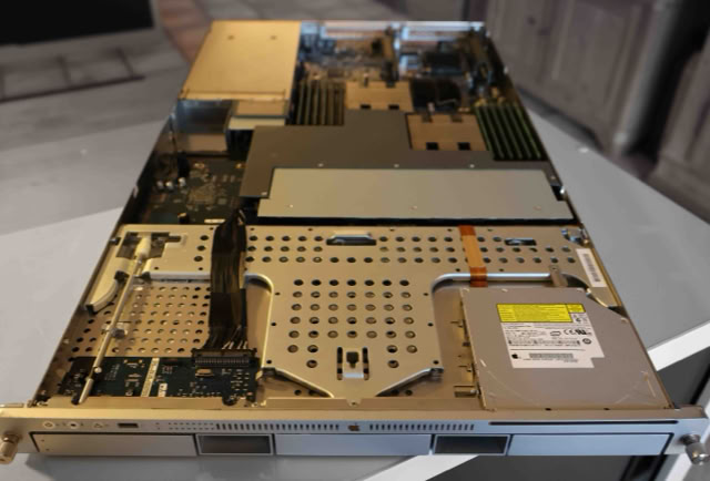 The most remarkable feature of the xserve was its rackmount case. The xserve case was a remarkable feat of engineering. The four drive bays were accessible via the front panel, as was one of the firewire ports, and the CD-ROM drive. Multicolored display lights on the front panel showed drive access, processor load, and ethernet link status.